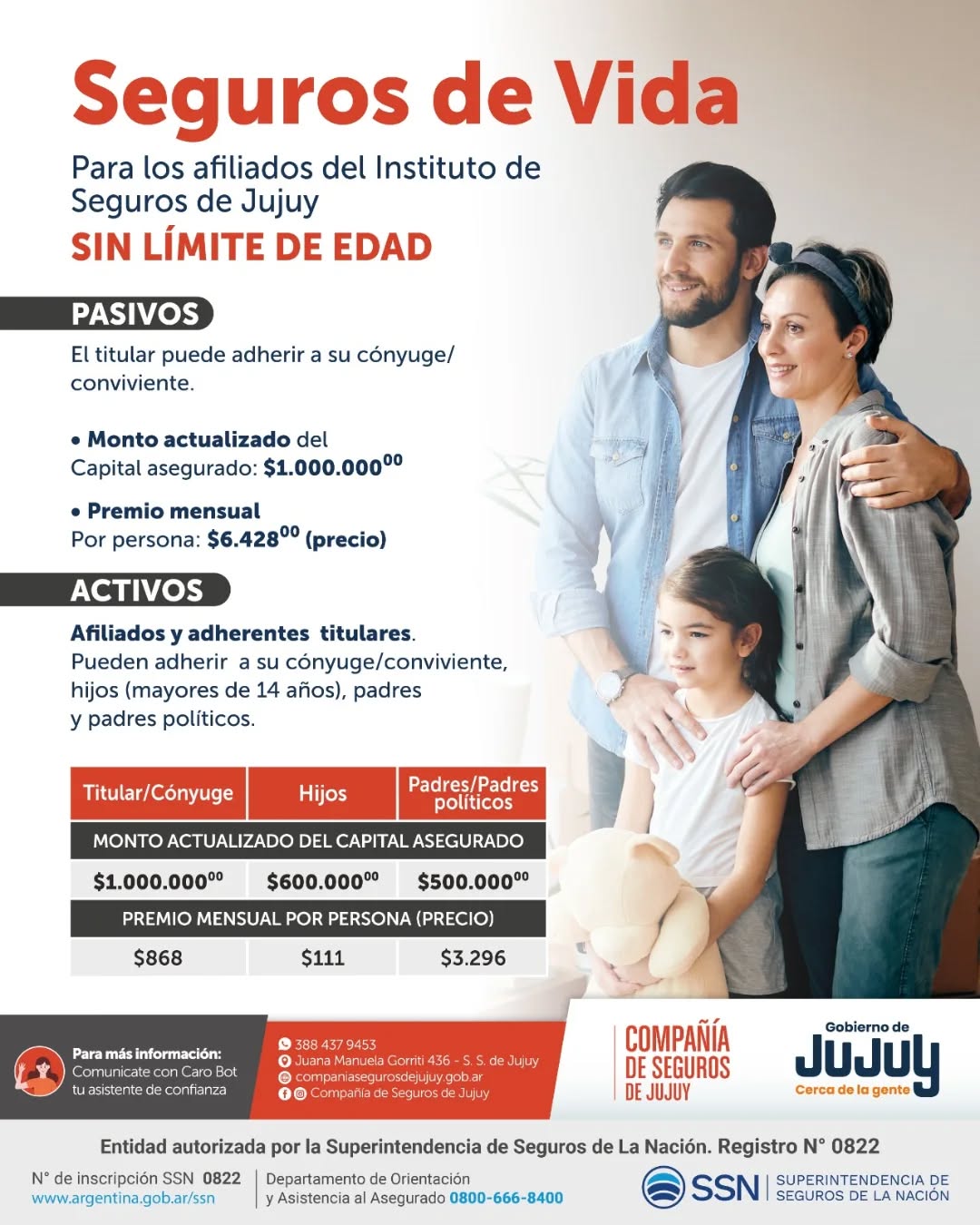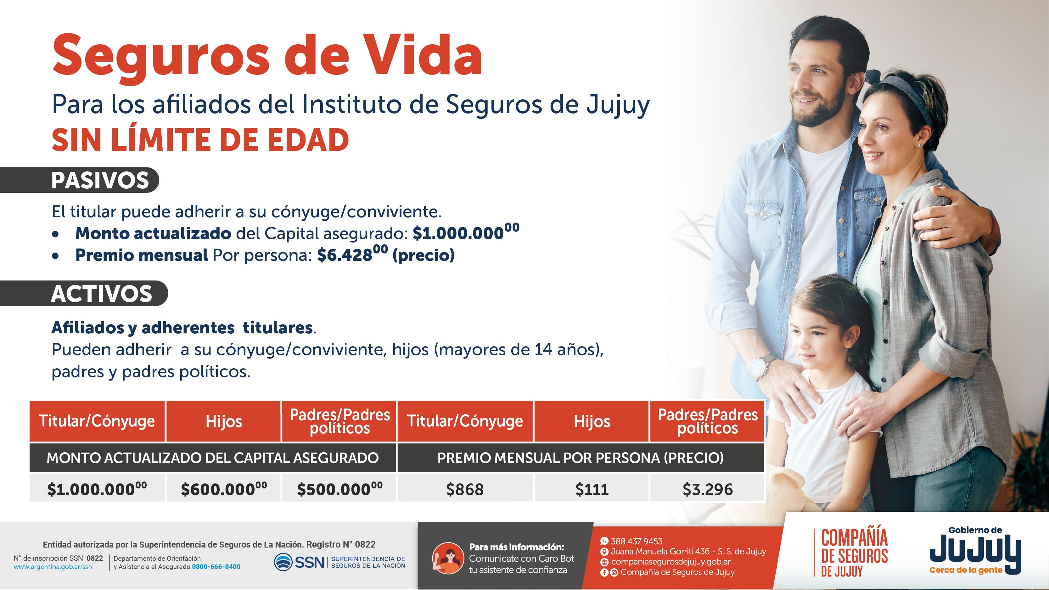 Con el propósito de ampliar los beneficios para el sector activo de la administración pública, provincial y municipal, acompañar a las familias jujeñas y brindar productos acordes, seguimos trabajando en seguros de prestigio y calidad para los jujeños. El Seguro Colectivo de Sepelio consiste en el nuevo capital asegurado, el cual asciende a $300.000,00 y el titular puede adherir al cónyuge o conviviente/ hijos hasta los 26 años (a excepción de hijos incapaces) / padres y padres políticos. Para solicitar más información, los interesados podrán dirigirse a la Compañía de Seguros de Jujuy ubicada en J.M.Gorriti N° 436, San Salvador de Jujuy, de lunes a viernes; de 08:00 hs a 16:00 hs.