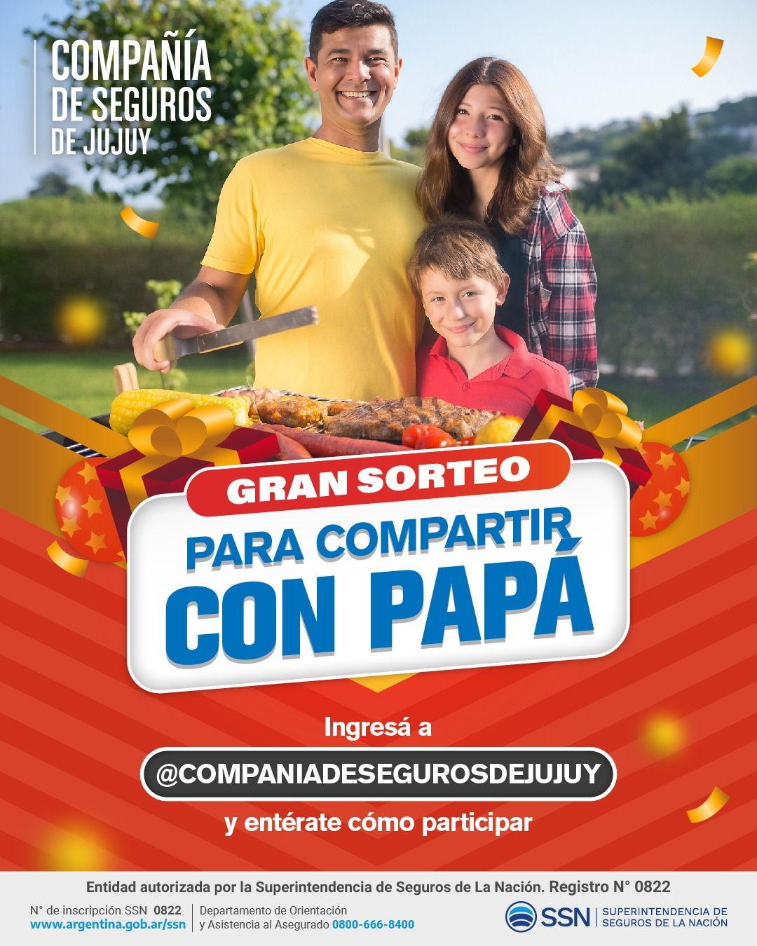 Sorteamos: tres kgs de asado, dos kgs de chorizo, una crema de locoto, dos gaseosas, un porta vino + copa + un vino de regalo, una bolsa de carbón, un set de asado, un bolso y una remera de COMPAÑÍA DE SEGUROS DE JUJUY, para que no te falte nada en tu festejo!
