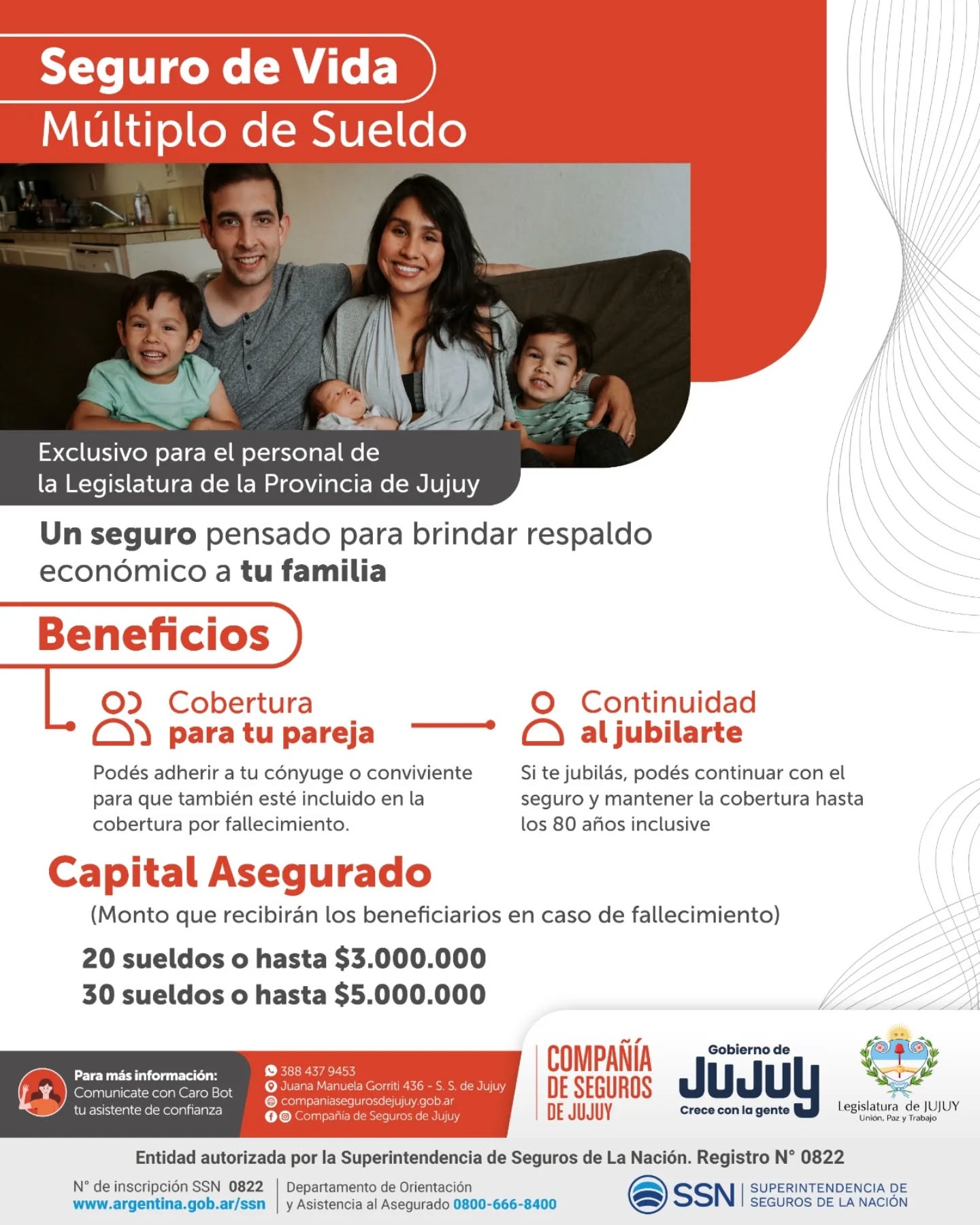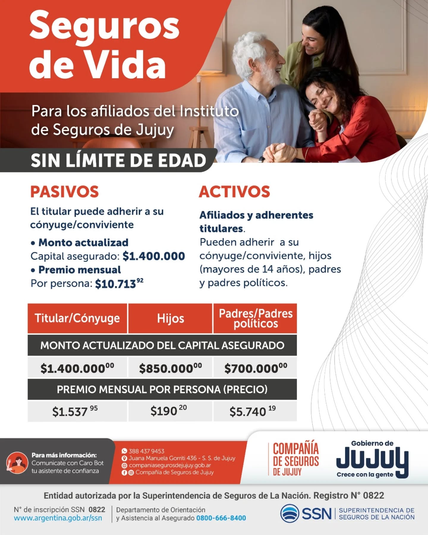 Con el propósito de ampliar los beneficios para el sector activo de la administración pública, provincial y municipal, acompañar a las familias jujeñas y brindar productos acordes, seguimos trabajando en seguros de prestigio y calidad para los jujeños. El Seguro Colectivo de Sepelio consiste en el nuevo capital asegurado, el cual asciende a $300.000,00 y el titular puede adherir al cónyuge o conviviente/ hijos hasta los 26 años (a excepción de hijos incapaces) / padres y padres políticos. Para solicitar más información, los interesados podrán dirigirse a la Compañía de Seguros de Jujuy ubicada en J.M.Gorriti N° 436, San Salvador de Jujuy, de lunes a viernes; de 08:00 hs a 16:00 hs.